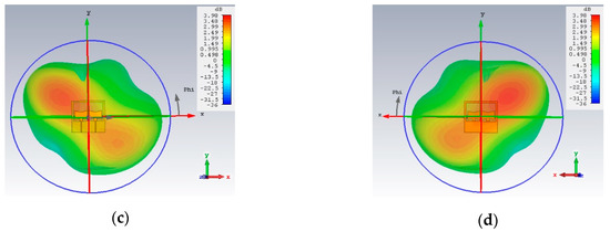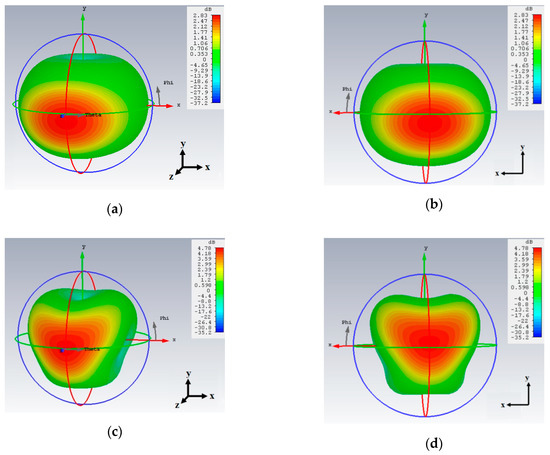 3D realized gain patterns of Antenna_1: At 868 MHz, views from (a) in front of the antenna’s plane and (b) at the back of the antenna. At 1.8 GHz, (c) in front of and (d) at the back of the antenna.