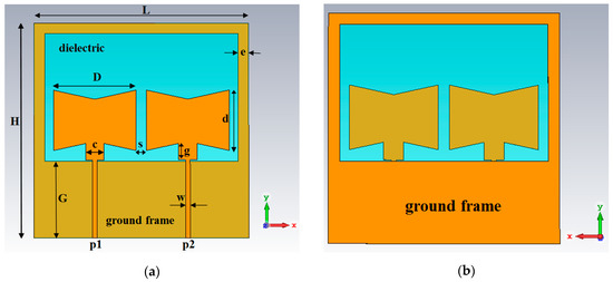 Given the satisfactory performance of the Antenna_1, its configuration was used for the synthesis of a two similar element array (Antenna_2). Its layout is depicted in Figure 5. The entire -xy- dimensions of the ground frame and of the dielectric were made a little larger than those of Antenna_1, in order for there to be room for the two bowties, and generally all the geometrical parameters of bowties, feeding lines, ground plane and dielectric were changed with the intention of each bowtie to hold, as far as possible, its operational features. The new values of the geometrical parameters are included in Table 2 and were found via repeated simulations.