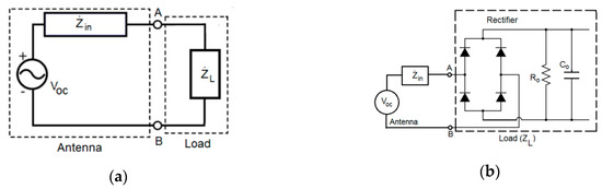 The results presented in the following section, at first, were received using a simple full wave rectifier with a ‘smoothing’ circuit, namely a capacitor in parallel with resistance, connected at its output. It is well known that a rectenna’s antenna, as more generally it is valid for an antenna which works as receiver, plays the role of a voltage source for the load at which it transfers the power captured from the environment. In the equivalent electric circuits shown in Figure 7a,b, Voc is the antenna voltage induced at the open circuited antenna input terminals, Zin is the complex input impedance of the antenna and ZL, in the case of a rectenna, is the impedance shown at the input terminals of the full wave rectifier connected at its output with a resistive load Ro in parallel with a smoothing capacitance Co. The power transferred from the antenna to the load, the DC obtained voltage, VDC, at the output of the rectifier and the power, Pin_rec available at the input of the rectifier, depend on all the above parameters.