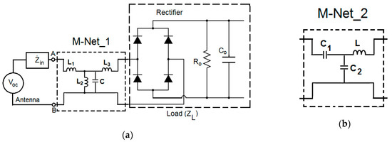 (a) The entire circuit of the antenna’s equivalent circuit connected to the rectifier through the M-Net_1 and (b) the M-Net_2.