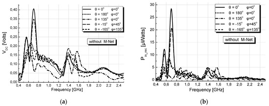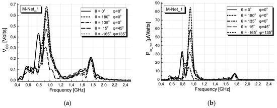 Figure 12a,b depict the variation, versus frequency, of VDC at the output of the rectifier and the power Pin_rec available at its input, for DoAs of incoming waves similar to those of Figure 10a,b, for comparison purposes. As shown, the M-Net_1 obtains satisfactory matching between 920 MHz and 960 MHz and between ~1.72 GHz and 1.82 GHz, shifting the two frequency bands of good performance, shown in Figure 10, towards the selected higher frequencies and additionally enhancing the performance of the rectenna, as, satisfactory higher voltage and power values are obtained. This enhancement is more intense in the low band. At the high band the values of the magnitudes are not much larger than those received without matcher between ~1.4 GHz and 1.6 GHz. For all that, the M-Net_1 improves the performance in the high band, obtaining to ensure the same levels of voltage and power, for all the DoAs of the incoming signals. In contrast, when a MN is not used, there is high spread of voltage and power values with respect of DoAs, between 1.4 GHz and 1.6 GHz, as shown in Figure 10b.
