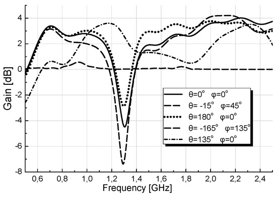 Figure 10a,b depict the variation, versus frequency, of VDC and Pin_rec, indicatively for some DoAs of incoming waves. The directions are described by the angle θ and φ in space, measured from the axes -z- and -x- respectively. For example, θ = 0° and φ = 0° describe the DoA of a wave coming from the front side and impinging to the antenna perpendicularly to its plane, while θ = 180° and φ = 0° describe the DoA of a wave perpendicularly incident to the antenna, however impinging to its back side. As expected, the values of the voltage and power vary strongly by frequency and DoAs of the waves and this performance is due to the dependence of the antenna’s Gain on the frequency and direction in space too, and it is ascertained by the Realized Gain graphs of Figure 11. At Figure 10a,b it is shown that although there is not any M-Net, a relatively satisfactory performance appears at two frequency regions. The lower one is in the UHF band, around 700 MHz and the higher, but with records less than in the lower, is between ~1.4 GHz and 1.6 GHz.