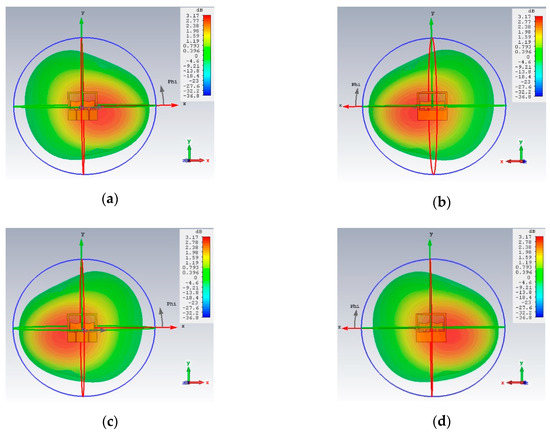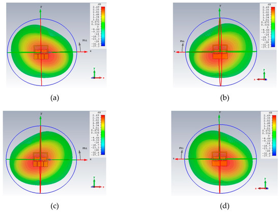 3D Gain patterns at 868 MHz: (a) and (b) in front of and back of the antenna plane when port p1 is fed, (c) and (d) respective results when port p2 is fed.