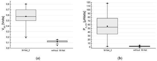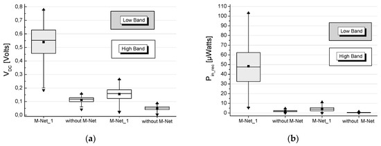 Figure 18a,b were received with M-Net_2 and depict the box charts for VDC and Pin_rec. The results were received for DoAs from the broadside and the backside of the antenna similarly to the results with the M-Net_1. The statistics were made over the total of 14 directions, with frequencies around 868 MHz and for the rectifiers of both bowtie elements, the statistical total being 594 samples. The records of the rectenna are: the mean value of VDC is 580 mV with M-Net_2 and 120 mV without M-Net. The IQR range of the distribution, with the M-Net_2, extends from 500 mV to 700 mV and without M-Net from 112 mV to 127 mV. Regarding the Pin_rec, with the M-Net_2, the mean value is 58 μW and the IQR range extends from 35 μW to 78 μW, while without M-Net the mean value is 2.5 μW and the IQR range extends from ~2 μW to 3.5 μW. In this band the mean efficiency value is 68.3% with the M-Net_2 and, as expected, very low (4.1%) without MN.