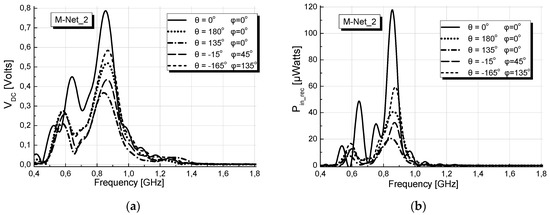 Figure 16a,b depict the variation, versus frequency for the voltage VDC at the output of the rectifier 1 and the power Pin_rec available at its input, for DoAs of incoming waves similar to those of Figure 10a,b. As shown the M-Net_2 obtains satisfactory matching round 868 MHz.