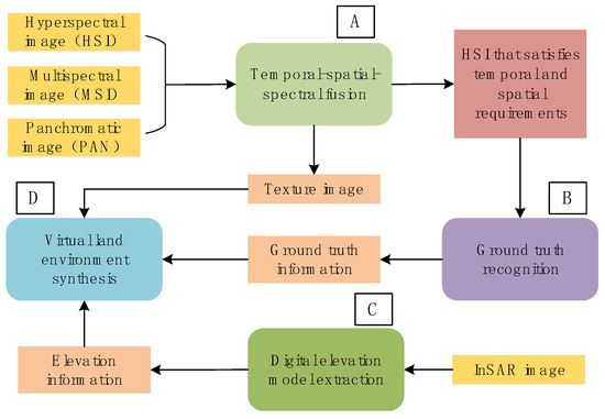 Based on the above analysis, the virtual land environment used in the virtual test is more important to be used as the modeling basis of other natural environments and the sensing basis of various sensors. What is more, it is a three-dimensional land environment which contains various information, such as ground truth, objects material, color, texture, etc. Therefore, as shown in Figure 1, we propose a scheme to construct a virtual land environment using multi-source satellite earth observation data, which is a joint application of multi-sensor data [38]. Based on hyperspectral, multispectral, panchromatic, and other optical earth observation data and radar earth observation data, such as InSAR, the construction of virtual land environment is completed through four steps: Temporal-spatial-spectral fusion (A), ground truth recognition (B), elevation extraction (C) and synthesis (D). Among them, ground truth recognition (B) is a key step, which is responsible for providing accurate information, such as ground truth, material, etc for the virtual land environment. The HSI classification method proposed in this article belongs to this step, and the ground truth information is obtained through the classification of HSI.