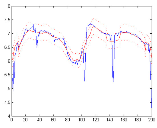 The blue line in Figure 2 is the entropy curve, in which the horizontal axis represents the spectral dimension and the vertical axis represents the entropy of each spectral band. The smoothness of the entropy curve determines the window size m and the threshold factor . If the entropy curve is smooth, the change of the adjacent spectral band information, i.e., the uncertainty of the band information is small; thus, the number of bands outside the relevant range, i.e., the probability of having an uncorrelated band, is also small. In this condition, few spectral bands are redundant, thus, smaller and m values should be chosen to improve the ability of excluding redundant bands. On the contrary, if the entropy curve fluctuates greatly, the change of the adjacent spectral band information, i.e., the uncertainty of the band information, is large; thus, the number of bands outside the correlation range, i.e., the probability of having an uncorrelated band, is also large. In this case, more spectral bands are redundant, thus, larger and m values should be chosen to exclude the redundant bands and retain the bands with valid information.
