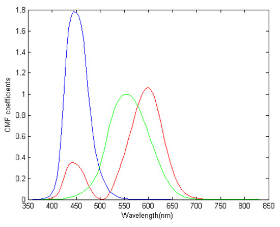 The color matching function (CMF) in CIE 1931 standard chromaticity observer [40] described the human eye visual color characteristics. This function was used to achieve the complete process of preliminary selection of spectral bands based on the calculation of entropy. At a specific wavelength, the CMF determined the number of the three primary lights (red, blue and green), which must be mixed in a certain order to achieve the same visual effect as the corresponding monochrome light at that wavelength. By applying the CIE color matching to hyperspectral images in the visible range, hyperspectral images can be represented by the corresponding color matching [41].