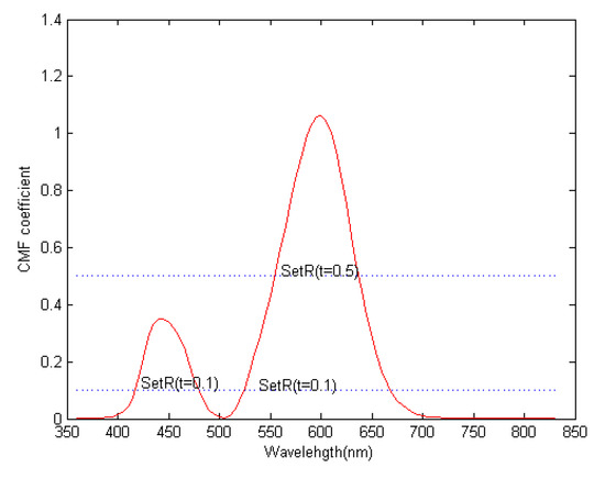 In Figure 4, two spectral thresholds (t = 0.1, t = 0.5) were set for the coefficient variation curve of the CMF of the red light. When the CMF coefficient is above the threshold, the corresponding spectral bands were preserved. It was challenging to set the value of the parameter t without a specific application. In this article, an automatic threshold method was used to define the optimal threshold t to maximize the amount of discarded information. Use to label the set of channels which are discarded by threshold processing of the CMF and to label the complementary set of . The optimal threshold is defined as