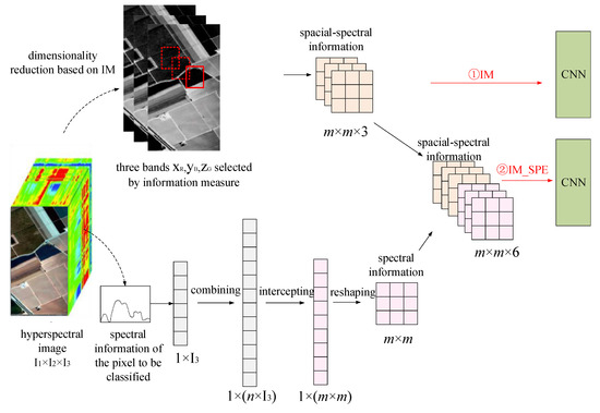 Three spectral bands, , were selected for the dimensionality reduction of hyperspectral image based on the information measure, and three grayscale images were obtained. There were two strategies to enter the CNN network, as shown in Figure 5. In the first strategy, the three spectral bands were directly used to extract the neighborhood around the pixel and classify the pixel into a patch of m × m × 3, which was put into the CNN for classification. This method was also called the information measure classification method (IM for short) because it directly used the dimensionality reduction results based on the information measure. In the second strategy, all the spectral information of the pixel was superimposed and classified on the above patch to form a patch of . All the spectral information of the central pixel of the patch was extracted, combined, intercepted, and reshaped. Then three layers of spectral information were obtained, which had the same shape and size as the three-dimensional spatial-spectral information extracted by the IM method. Then, the patch generated by the IM method and the new patch were superimposed and put into CNN for classification. In this article, the proposed method was called the information measure-spectral (IM-SPE for short) classification method.