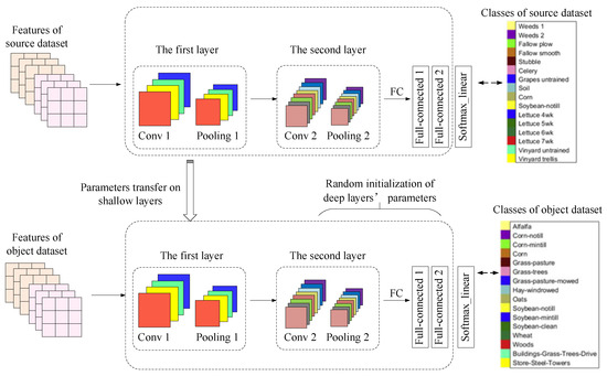 Training was performed on the source dataset to obtain the network model and parameters. The shallow layer structure and parameters were directly transferred to the object dataset, and the deep layer parameters were randomly initialized. Taking the CNN network structure of Figure 6 as an example (including two convolutions and pooling layers, and two fully connected layers), if the source hyperspectral dataset is highly similar to the object hyperspectral dataset, the adjustment of the deep parameters should be in the following order: The last fully connected layer (full-connected2), the first fully connected layer (full-connected1). If the source hyperspectral dataset is not highly similar to the object hyperspectral dataset, the convolutions and pooling layers (conv2 and pooling2) that extract the deep features may also need the random re-initialization of the weighting parameters. Specifically, in the proposed hyperspectral image classification process based on deep transfer learning in this article, the following two situations were mainly considered: