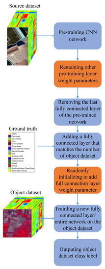The classification of hyperspectral image based on deep transfer learning can be used to better solve the problem that the sample data is insufficient or relatively small. The specific classification principle is shown in Figure 6.