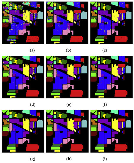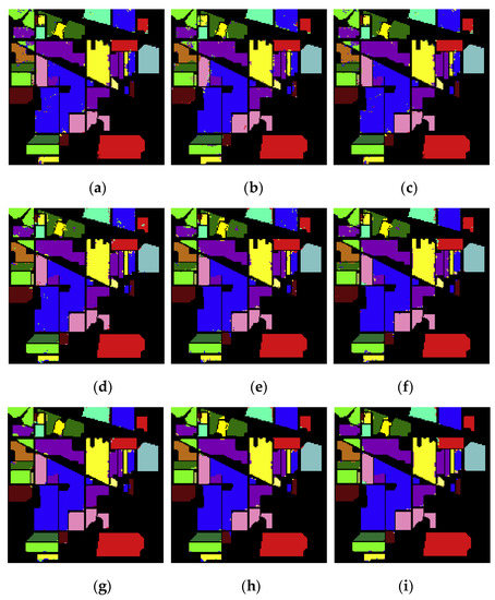 Figure 11a–i are the classification results of the NDR, IM, IM_SPE, NDR_MIG, IM_MIG, IM_SPE_MIG, NDR_MIG_DN, M_MIG_DN, and IM_SPE_MIG_DN methods on the Indian Pines data set
