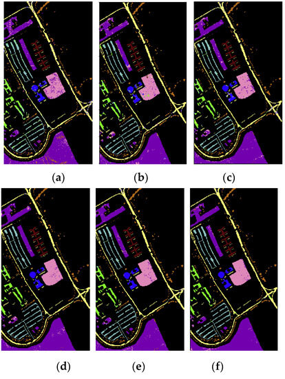 As can be seen in Figure 10, it is obvious that the information measure-based CNN classification method (IM and IM_SPE) can achieve higher classification accuracy on the Pavia University dataset. Moreover, the optimal neighborhood noise reduction method (IM_DN and IM_SPE_DN) can effectively reduce the salt-pepper-noise.