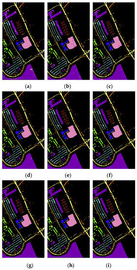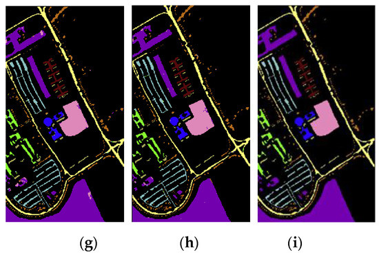 Classification results on the Pavia University dataset: (a) NDR; (b) IM; (c) IM_SPE; (d) NDR_MIG; (e) IM_MIG; (f) IM_SPE_MIG; (g) NDR_MIG_DN; (h) IM_MIG_DN; (i) IM_SPE_MIG_DN methods.