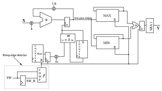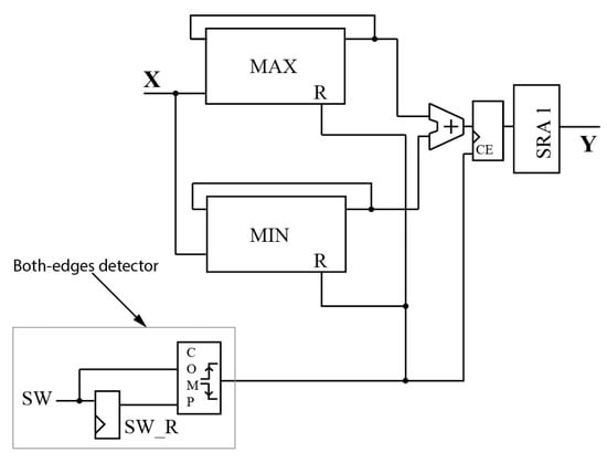 Figure 3 shows the digital schematic of the proposed filtering algorithm. As can be seen from the schematic, a rising-edge detector of the switching signal is used to reset the MAX and MIN blocks (R input) to the opposite side – the lowest value for the MAX block and the highest value for the MIN block. This is used to delete all data from the previous switching period. In addition, there is another switching period event detector which detects both edges to update the filter output. Using both edges to do this allows the system to increase the output frequency. In order to use fewer hardware resources, the operation of division by 2 is made by an arithmetic right shift by 1 (SRA1 in Figure 3), since these two operations are interchangeable in fixed-point notation.
