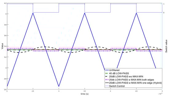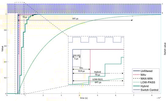 The first simulation experiment was carried out by connecting a step function signal to the input of the filters, as shown in Figure 7a. This experiment was made with the aim of proving the theoretical working principles of the proposed algorithms. Figure 8 proves that the experimental results of all MAv, MAX-MIN, LOW-PASS, and Hybrid filters meet the theoretical expectations. It can be seen that the MAv filter is being applied to each rising edge of the control signal with a small delay, caused by the delay of the hardware and medium algorithm complexity. The MAX-MIN filter is being updated during every event of the control signal, which can be also observed in Figure 8. In the first event of the control signal after the input is 1, the MAX-MIN filter gives an output of 50%, because it considers the current value (1) and the previous value (0). In the next control signal event, the output gets the final value, which is 100%. As can be seen, the MAX-MIN filter has the smallest, almost unnoticeable, latency time among the proposed filters, according to its simplest algorithm. In contrast with the MAX-MIN filter, the 40 dB LOW-PASS filter shows the slowest dynamic, caused mainly by the delay of the algorithm, while the Hybrid filter which uses an attenuation of 20 dB is about 10 times faster but still slower than the MAv and the MAX-MIN. To conclude the results of the step signal filtering, it must be said that all the proposed filters obtain the correct result after the corresponding latencies, so the mathematical approaches for these filters were chosen correctly.