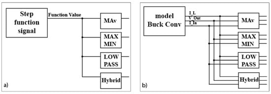 Architecture of the experiments shown in this section. (a) Model of the step function signal connected to the filters. (b) Model of the buck converter, connected to the filters.
