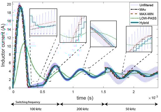 Figure 9 shows a transition from power off to nominal operation using a constant duty cycle. The accuracy of the LOW-PASS filter is significantly worse than the accuracy of MAv and MAX-MIN filters because of its slow dynamic. Considering this, the following experimental conclusion can be made: the 40 dB LOW-PASS filter is not applicable for use during transients. However, the hybrid filter shows better dynamics. We have to take into account that the switching frequency is not constant in many applications. Therefore, during the experiment made for Figure 9, the switching frequency has been changed from the original one, 100 kHz, to 200 kHz and 50 kHz in order to test the behavior. The experiment shows that the proposed filters are updated correctly for the different frequency ranges. It is also noticeable that if the switching frequency is lower, and therefore closer to the natural frequencies of the power converter, the relative importance of latency increases. For example, when the switching frequency is 50 kHz (right part of Figure 9) the phase delay of the Hybrid filter is clearly visible. However, when the switching frequency is 200 kHz, the phase delay is much smaller. The results of the output voltage and input current have the same behavior, so they are not shown in this paper for the sake of shortness.