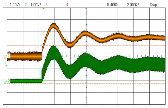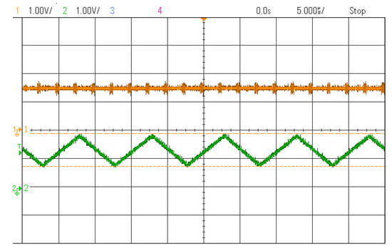 Finally, all the models have been downloaded to a Digilent Arty A7-35 to check the integration of the complete HIL system (model and DACs). Figure 10 shows the transient process of the inductor current of a buck converter with two different DACs: a high-speed DAC (AD9767 from Analog Devices)—lower line—and a low-speed DAC (PMOD DA2 from Digilent)—higher line. The output that goes to the low-speed DAC has been previously filtered using the MAX-MIN filter. Therefore, the ripple has been removed while having the same numerical average results. Likewise, Figure 11 shows the steady-state of both DACs. It is obvious that a high-speed DAC offers a more realistic analog output but, as was explained in Section 1, high-speed DACs have parallel interfaces so they require a lot of FPGA output pins to be used. As the number of output analog channels of a HIL system is growing in importance and the overall cost of HIL platforms is decreasing, the use of cheaper and lower pin count DACs must be taken into account. As these DACs offer lower speed, using the proposed filters may be considered as an alternative.