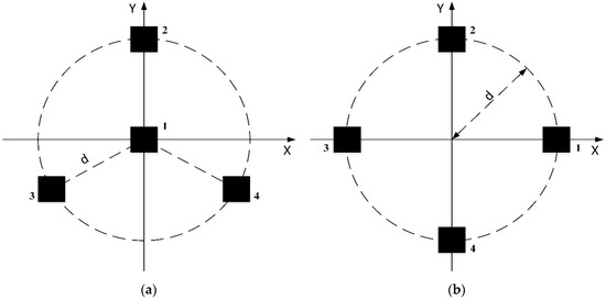 Two different distributions of antenna elements, as shown in Figure 1, are considered in this paper, which are commonly used as the array geometry for GNSS antenna arrays. Note that the element distribution G1 consisted of elements that are equally spaced on a circle with a half-wavelength radius (i.e., d = 0.5 as shown in Figure 1) and an element at the circle’s center. In element distribution G2, the antenna elements are uniformly spread on the perimeter of a circle with a radius of half a wavelength.