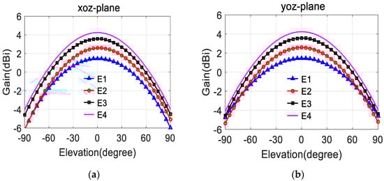 Gain patterns of the four different antenna elements in Figure 3: (a) xoz-plane; (b) yoz-plane.