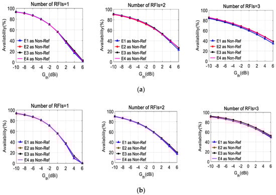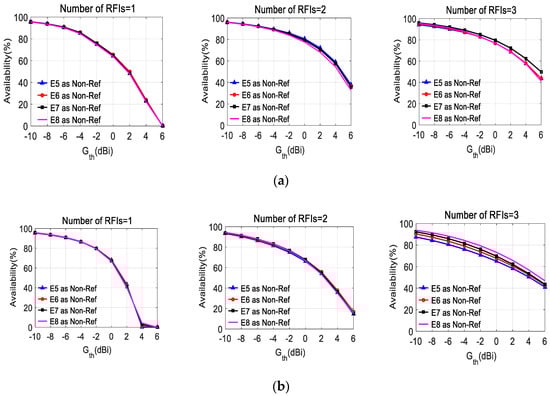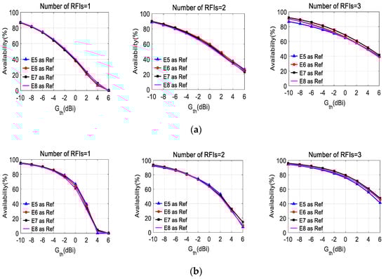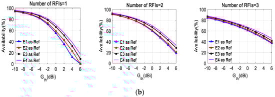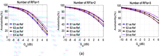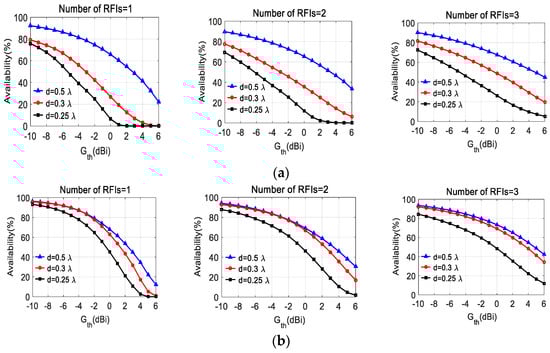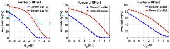 In Figure 5, the average angular availabilities of arrays with different gain patterns of reference elements are shown as a function of the values of the selected threshold Gth, for the case of G1 and G2, respectively. The results are shown for different numbers of RFIs (radio frequency interferences) in each case. It can be seen from Figure 5 that the availability improves with the increase of the gain of reference elements under the selected array geometries.