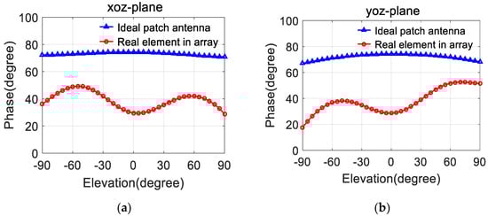 Phase pattern comparison of the ideal patch antenna and the real element in the array: (a) xoz-plane; (b) yoz-plane.