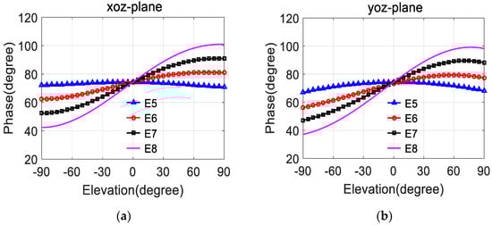 Secondly, the performance of arrays with different phase patterns of antenna elements is investigated. The effect of gain patterns is neglected here. Since the phase is a relative concept, we usually take the zenith direction as the zero-phase reference point. Additionally, the phase pattern of the patch antenna in this paper has some characteristics that are nearly unchanged with the increase of elevation angle; however, the phase will fluctuate with the increase of elevation angle as the patch antenna is located in the array. The phase pattern comparison between the ideal patch antenna and the real element in array is depicted in Figure 7. Note that the phase fluctuation of the real antenna in the array with the increase of elevation angle is generally from 0 to 30 degrees compared to the zero-phase reference point. According to this characteristic, we artificially designed four different antennas, named E5, E6, E7 and E8, the phase patterns of which are shown in Figure 8.