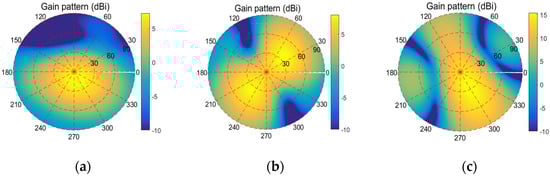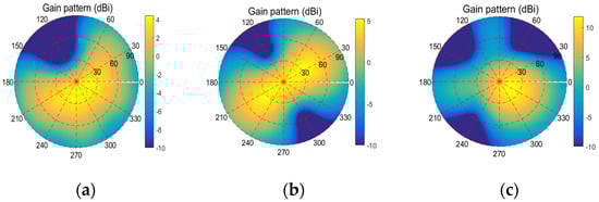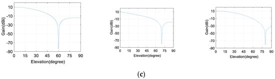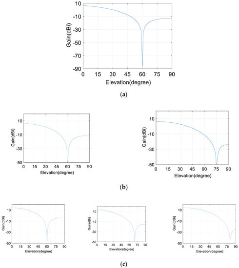 Figure 11 plots the adaptive gain of the four-element array (G1) towards the direction of the interferences in the specific scenes. Furthermore, the elements in the array are all selected as E1. As shown in Figure 10, the nulling (about −90 dB) in the presence of one interference is much deeper than that (about −50 dB) when there are two or three interferences. This deeper nulling will cause the region where the adaptive array gain is less than the threshold to become much larger, as depicted in Figure 12. On the other hand, the maximum array gains in Figure 12a–c are 7.24 dB, 8.03 dB and 15.35 dB, respectively; that is, the array gain will be larger in a region far from the nulling as the number of RFIs increases. In summary, the availability will increase and the nulling capability will decrease as the number of RFIs increases.