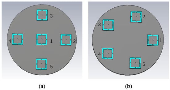 As depicted in Figure 15, five-element patch arrays were designed in CST Microwave Studio (Dassault Systems, Vélizy-Villacoublay, France) using the array geometries in Figure 1. One more element is added to G1 and G2 to increase the mutual coupling between elements. Note that the reference elements are both located at element 1, as shown in Figure 15, and the radii of the array are 0.5 , 0.3 and 0.25 , respectively. The other experimental conditions are the same as those in Section 3.
