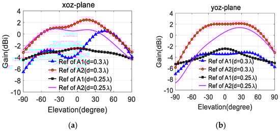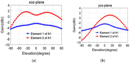 Radiation patterns of element 1 and 2 of A1 (d = 0.25 ): (a) xoz-plane; (b) yoz-plane.
