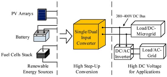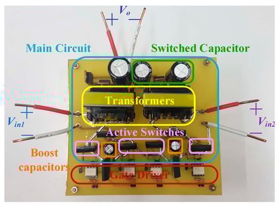 Theoretically, conventional step-up converters, like Boost and Flyback [3,4,5,6], can achieve a high voltage gain under the operating with extremely high duty ratio or the design of a much higher turns ratio. However, extreme high duty cycle or turns ratio will dramatically degrade the conversion efficiency due to large conduction loss and copper loss of windings. In order to improve conversion efficiency and voltage gain, many transformerless high step-up converters are proposed [7,8,9,10]. Although these converters are designed to achieve high step-up characteristics with reasonable duty ratio, here still exits some problems, for instance, large transient current and limited voltage gain, confining converter flexibility. To mitigate the mentioned drawbacks, converters incorporating coupled inductor and/or switched capacitor are proposed [11,12,13,14], however, which are only able to process single-input source. In order to deal with two different kinds of inputs, dual-input converters (DIC) are proposed. In comparison with single input, a dual generation system is capable of providing higher reliability, durability and power rating. The structure of DICs can be simply classified as series type and parallel one. The conventional series-type DICs construct string connection at input ports [15,16]. Such a DIC will malfunction in case that either of the two inputs fails. The parallel-type DICs collocate different sources in parallel so that even if one of the inputs is out of commitment, it still can accomplish voltage stepping to meet DC-bus level [17,18,19,20,21,22,23]. Some of them are controlled with time-sharing scheme. That is, only one DC source is permitted to delivery its energy to the load at a time. Compared with series-type DICs, parallel ones possess much better features from the aspects of reliability and controllability. Nevertheless, limitation on voltage gain is unavoidable, which confines converter applications in the field of high DC-bus voltage requirement.