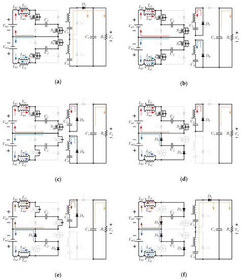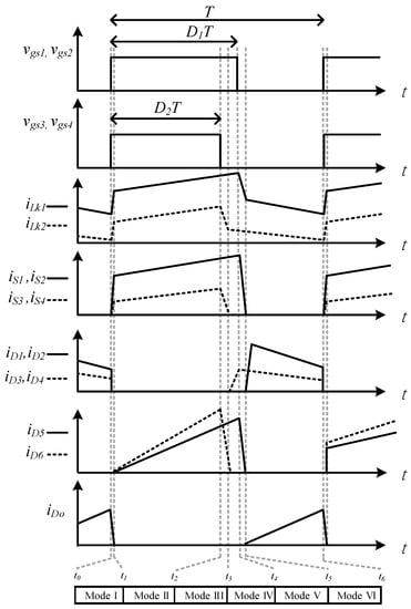 The driving pattern relating to the four switches is the same as that discussed in the previous section. The S1 and S2 are closed for D1T and S3 and S4 for D2T. In addition, the duty ratio of D1 is greater than D2. Based on the assumptions made at the beginning of this section, states 2, 4 and 6 in Figure 4 will dominate the converter operation.