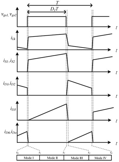 The switches S1 and S2 are turned on/off simultaneously, so do the switches S3 and S4. Assume that the turn-on period of S1 and S2 is D1Ts and D2Ts is for S3 and S4. In addition, the magnitude of Vin2 is twice that of Vin1. While the proposed DHSIC operates at DIO and in continuous conduction mode (CCM), converter operation over one switching cycle can be divided into six states. Converter operation will be described state by state as the following proceeds with. In addition, the equivalent of each state and conceptual waveforms are depicted in Figure 3 and Figure 4, respectively.