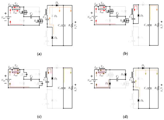 - State 4 [t3~t4]: The equivalent circuit refers to Figure 6d, in which the magnetizing inductance forwards its stored energy to charge capacitor C1 and to the output via the ideal transformer. Meanwhile, the leakage energy of Lk1 is recycled to C1, which also suppresses the voltage spike on the active switches. Over the time interval from t3 to t4, switches S1 and S2 are open. With respect to diode, the D5 is in reverse state but D1, D2, D6 and Do are forward biased. State 4 is also a major state similar to State 2, dominating the converter operation. Both switches S1 and S2 will be turned on again at t = t4 and then this state ends. Converter operation over one switching cycle is completed.