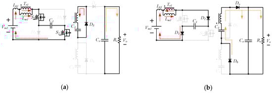 - State 1 [t0~t1]: If only Vin1 supplies the converter, power processing is controlled by switches S1 and S2. Both switches are turned on at t = t0 and converter operation begins. As shown in Figure 6a, the voltage across Tr1 will be equal to the series voltage of C1 and Vin1. Magnetizing inductance Lm1 pumps its stored energy to the secondary of Tr1. Therefore, the current flowing through Lm1 decreases. The current iLk1 increases quickly. When iLk1 is equal to iLm1, this state ends. At this time, the current flowing through the diodes Do and D6 also drops to zero. That is, the reverse-recovery problem of both diodes is therefore resolved.