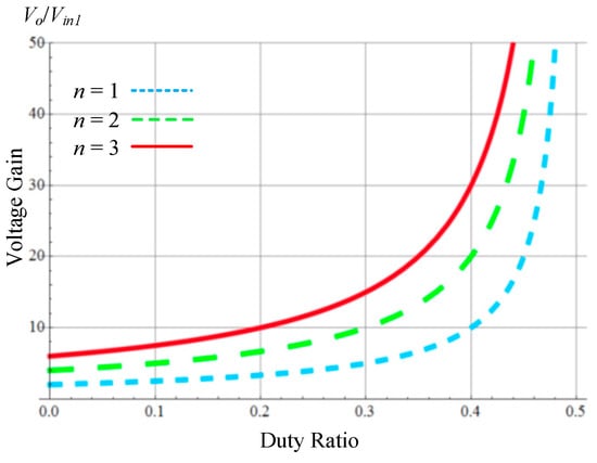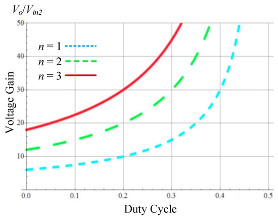 Assume that Vin2 = 2Vin1, D1 = D2 = D, and n1 = n2 = n, according to Equation (11), Figure 9 represents the relationship of voltage gain versus turns ratio, while under DIO situation.