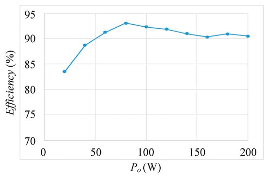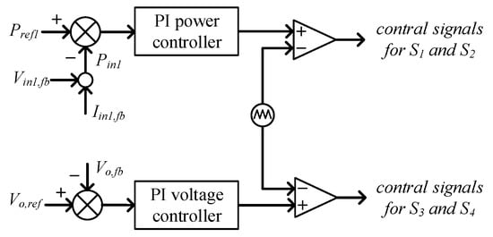 To verify the proposed DIC, a 200-W prototype is built, simulated and measured. Converter parameters and components adopted are summarized in Table 2. The control block diagram of the prototype is depicted in Figure 11. Power of input port 1 is calculated according to the detected input voltage and current, that is, Vin1,fb, and Iin1,fb, and then it is compared to a reference Pref1. The control signals for S1 and S2 are determined by the PI power controller and the carrier. Accordingly, the input power at port 1 can be readily controlled. With respect to the other part of the control block diagram, the output voltage is regulated by controlling the switches S3 and S4. With such voltage regulation, the input port 2 can accommodate the supplement to output power and thus power dispatch at both input ports is accomplished. The proposed converter adopts MCU dsPIC30F4011 to serve as system controller. Figure 12 shows the control signals and the corresponding input currents at full load under DIO situation. In Figure 12 the duty ratios of S1 and S2 are 0.32 and 0.23, respectively, which is consistent with Equation (11) for a 400-V output. Meanwhile, the switch voltages, vds1 and vds2, are measured and shown in Figure 13, from which it can be observed that there is no voltage spike on active switches. That is, the boosting capacitors C1 and C2 are able to recycle leakage energy and can effectively clamp switch voltage. Additionally, withstood voltages on the switches at port 1 and port 2 are 34 V and 45 V, respectively, which verifies the theoretical analysis results of Equations (12) and (13). Figure 14 is the measurement of the voltages of boosting capacitors. This figure reveals that voltages of C1 and C2 are in turn 34 V and 45 V, both voltage magnitudes of which meet the theoretical results of Equations (4) and (8). While step change takes place from half load to full load and then drops back, Figure 15 shows the related output voltage and current. Figure 15 illustrates that constant 400-V output still can be kept with even under step change. The overshoots at step-up and step-down transitions are only 1 V and 0.7 V, respectively. With respect to SIO situation, once power failure occurs at input 1, Figure 16 shows the measured control signal, output voltage, and input current. Similarly, if at input 2, Figure 17 is the related measurement. Both figures demonstrate the operation ability of the converter at SIO situation. The measured waveform of output current is presented in Figure 18, from which it can be observed that the output current of the converter is near to be ripple-free. The efficiency of the proposed converter is measured and then shown in Figure 19, in which the peak value is about 91.4%. In the experiment, a very low level of voltage, Vin1 = 12 V, is considered, therefore, which yields that higher current has to be demanded at a specific power, resulting in large conduction loss. This is the major reason why the converter efficiency is not as high as satisfied in the measurement. However, if input voltage is raised, the converter efficiency will be advanced. At single-input situation, if only the 24 V of Vin2 suppled the DHSIC, measured converter efficiency is shown in Figure 20. This figure reveals that a higher voltage input can yield a better efficiency even under the operation of single input. A photo of the built-up DHSIC is shown in Figure 21.