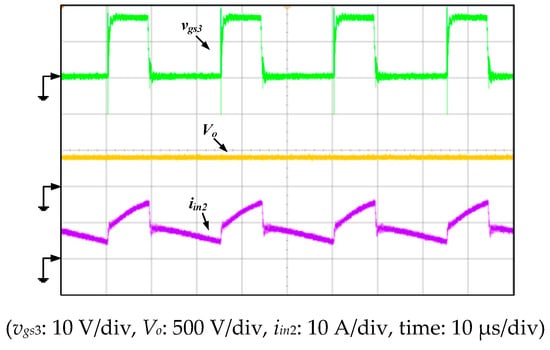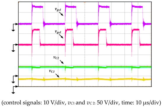 With respect to the DIO situation, the DHSIC has the same control scheme shown in Figure 3. The S1 and S2 are closed for D1T and open for (1 − D1)T, while S3 and S4 are closed for D2T and open for (1−D2)T over one switching period. Equations (4) and (5) can be applied to the finding for the voltages of C2 and C4. That is, VC2 and VC4 are calculated by