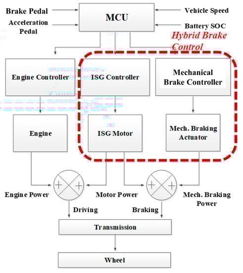 As previously mentioned, the ISG drive provides the driving or braking force to the wheel, in an effort to increase efficiency of the traction drive. Regenerative control, which is an ISG application, generates a braking torque to provide a braking force and charge the battery [17]. This brake system has recently been improved upon to produce the hybrid brake, which combines mechanical and electrical braking features using an ISG to enhance the driving distance [17,18,19,20,21,22]. Figure 2 shows the control method of the hybrid brake: the main control unit (MCU) controls the brake torque (which is provided by the electrical and mechanical brakes), taking into consideration the battery’s state of charge (SOC). When the brake torque from the brake pedal is beyond the battery’s capacity, MCU transfers the remaining brake torque to a mechanical brake controller. This hybrid system not only transfers brake energy back to the battery, but also enhances the mechanical brake’s life by reducing abrasion.