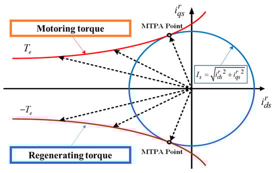 On the other hand, various d-/q-axis currents can generate specific torque and power, according to Equation (1). Specific torques identified according to Equation (1) can be expressed by various d-/q-axis current combinations, as shown in Figure 3. The most efficient current point is the maximum torque per ampere (MTPA) point, which points to the minimum current magnitude. As shown in the figure, generating and regenerating torques have a symmetrical relation to the q-axis. If the same amount of torque is generated or regenerated, the d-axis current for the MTPA point is the same and the q-axis current for the MTPA point only changes direction. Therefore, if the MTPA points of various motoring torques are identified, the MTPA points of regenerating torques are easily estimated.