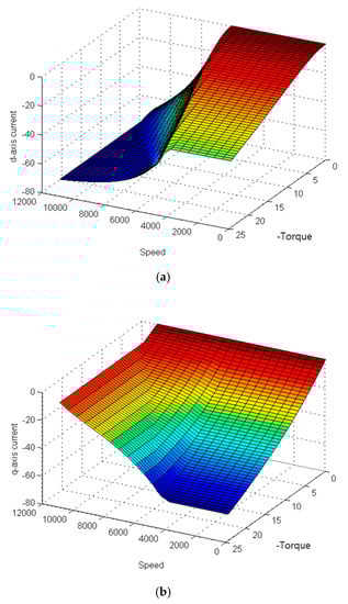 The ISG needs to satisfy a broad velocity region through a field weakening technique, which reduces the back-EMF voltage. However, the d-/q-axis current point for field weakening control is affected by PMSM parameters, as described in Equation (5), especially for resistor variation. Because the voltage drop caused by the resistor is easily changed by operating temperature or humidity, optimal d-/q-axis currents for specific generating and regenerating torque in a field weakening region have large differences. Thus, current data in an LUT for a field weakening region is usually experimentally established. In addition, because the LUT has to reflect torque command as well as current speed for the field weakening operation, it needs to be two-dimensional (2D-LUT). Figure 4 shows the 2D-LUT of the ISG motor used in this paper.