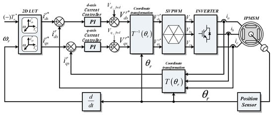 Electrical components in vehicles are continuously modified to suit specific needs and requirements, and enhance drive efficiency [1,2,3]. A variety of electrical systems are used in vehicles and operating motors to improve fuel efficiency and performance. However, this has led to a rise in electric power consumption, especially with the application of active steering, suspension systems, and braking devices; mechanical or hydraulic motors are being replaced by electric drive systems. A permanent magnet synchronous motor (PMSM) drive for integrated starter and generator (ISG), nevertheless, have certain advantages. It not only propels initial driving power, but also reduces fuel consumption with an idle stop and go function. An ISG implements regenerative braking, which improves fuel efficiency by recovering some of the energy lost during conventional braking [4,5,6].