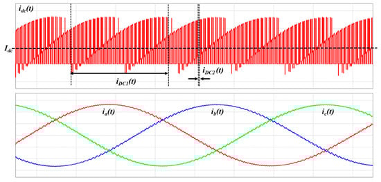 From this equation, it can be seen that instantaneous DC-link current is affected by motor back-EMF; the DC-link current has the 6th harmonic component. Therefore, Equation (9) can be approximately transformed to the following equation: