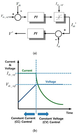 We will first explain the constant current and voltage control method for battery charge using a general DC-DC converter. Using the configuration shown in Figure 1a, battery current and voltage can be substituted by DC-link current and voltage. Figure 7a shows the general constant voltage (CV) and a constant current control block; operation of this block is shown in Figure 7b. In Figure 7, the DC-link voltage is controlled by a PI controller. The output of the voltage controller is limited by the desired current reference for CC control operation. During the CC control operation, because the target voltage does not reach the reference, the voltage controller output is saturated by the PI controller. The desired current reference for the CC operation is then inserted into the limiter to adjust the saturated voltage controller output. This saturated current reference is input into the current controller to control the battery current. If the battery voltage reaches the reference value, the saturated voltage controller is released, and CV control is initiated. CV operation reduces the battery current, and subsequently the voltage drop by battery impedance is also decreased. Consequently, the open terminal voltage of the battery is set as the voltage reference. Figure 7b shows the CC-CV control result.