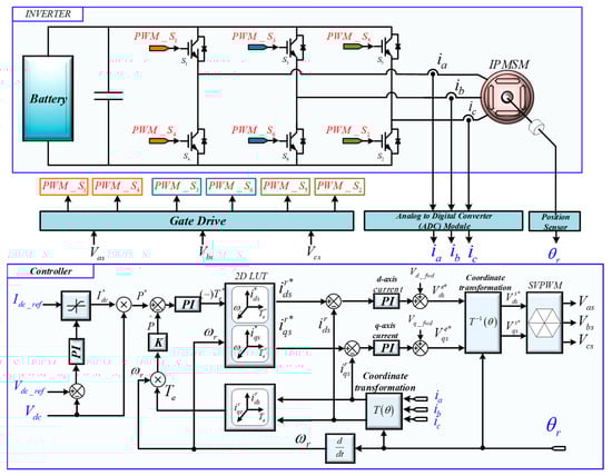 Figure 5 shows a block diagram of the algorithm used for instantaneous torque control in a PMSM. As mentioned earlier, the current reference to generate specific torque for MTPA and field weakening operation is output using 2D-LUT. On using the identified torque, the battery can be charged through torque assist and regeneration of the ISG system. However, the conventional ISG system does not include a separate algorithm for effective charging of the battery [23,24]. It simply ensures voltage control—maintains nominal voltage—when there is an increase due to overcharging of the battery. However, such a control method is insufficient for efficient battery use, because it fails to have appropriate current control. In this case, the current sensor is simply used to detect the overcurrent flowing in the battery, instead of being used for current control.