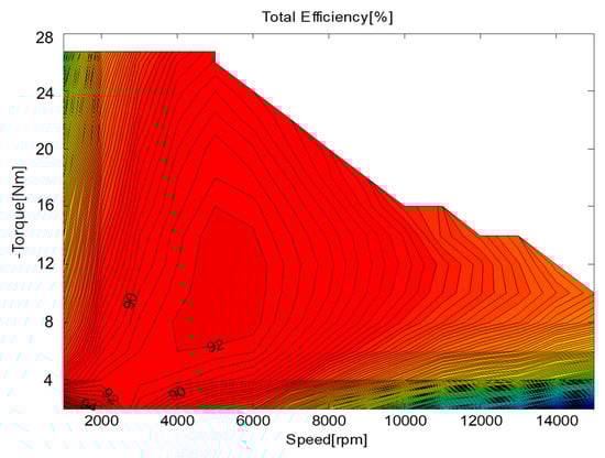 On the other hand, the efficiency of PMSM drive is affected by copper and iron losses. Copper loss is the dissipation of energy caused by nonlinearity between the current and flux—hysteresis and eddy current losses. Therefore, this loss is proportional to motor speed. Iron loss is the loss caused by resistance of the windings. Therefore, this loss is proportional to motor current. As a result, to achieve correct power control, parameter K has to consider motor speed and torque. Figure 10 shows the estimated efficiency of the target motor drive, according to motor speed and torque.