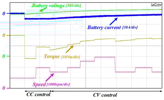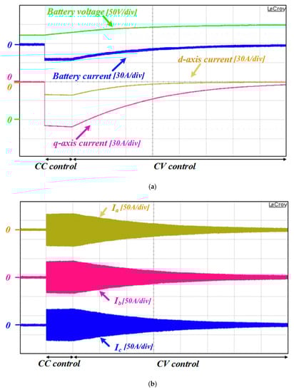 Figure 12 provides the results of the CC-CV control; Figure 12a shows the battery current and voltage, Figure 12b shows the three-phase currents during the CC-CV operation. Load motor is coupled with a target PMSM to ensure that motor speed is the rated 4800 rpm, and time division of all figures is 1 s/div. At this speed, the battery charging current reference is set as 28 A, the maximum charging current; and battery voltage reference is set as 250 V, the rated full-charging voltage. As shown in the figure, when charging control is initiated, the battery current is well controlled with current reference of 28 A. During this CC control period, q-axis current increases in accordance with the rising battery voltage, because the required charging power for constant current is increased by the battery voltage.