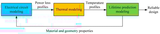 Figure 2 shows the process of lifetime prediction for the IGBT module [21]. The characteristics of the current flowing to the IGBT module and the its thermal behavior depend on the application. Therefore, electrical-circuit modeling is needed to analyze the thermal characteristics of the IGBT module according to the application. Through electrical-circuit modeling, power loss profiles can be obtained based on load variations and the current flowing to the IGBT module. The thermal models of Cauer and Forster are well known and they are generally based on the junction temperature estimation [15,21]. The temperature profiles are established by substituting the power loss profiles into the thermal model. Based on the temperature profiles of the specific application, the lifetime of the IGBT module in the power converter can be estimated. The number of thermal cycles to failure can be determined by the temperature profiles and the thermal cycles determine the lifetime of the IGBT module [13,21]. The modeling of the lifetime prediction can be classified as empirical modeling and physics-based modeling. Empirical lifetime modeling is based on a large database of the junction temperature, which can be obtained via long-term experiments. The parameters related to the number of cycles to failure can also be obtained using the database of the junction temperature. Physics-based lifetime modeling utilizes the detailed physical and geometric characteristics of the IGBT modules. To determine the number of cycles to failure, the physical characteristics of the materials in the IGBT should be parameterized. Here, the thermal profiles are used for the parameterization. The lifetime-prediction model is used to improve the reliability of the IGBT modules and is applied to the design process for a reliable power-conversion system.
